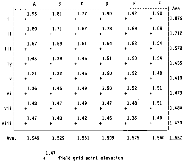 The first six columns and the first eight rows of Booher's example field have been extracted and are shown in Figures 64 and 65. The locations of the field boundaries have been changed relative to the grid system to illustrate the importance of weighing grid point elevations based on the areas they represent. In the following example the standard grid spacing is 20 m by 20 m and begins one-half spacing from the upper left corner of the field (represented by the grid point [i, A] in Figure 65). The standard grid area is 400 m2, but one will note that grid points adjacent to the right field boundary represent 500 m2. One point, the lower right grid represents an area of 375 m2.