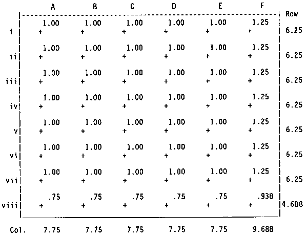 The first step in the calculation of the revised field plane is to determine the grid point weighing factors using Eq. 118. Using the standard area per point as 400 m2, the weighing coefficients, q ij, are shown in Figure 66. The row and column weights are the sum of the grid point weights and are shown to the left and at the bottom of Figure 66.