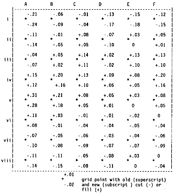 If this relationship is used to recompute the elevations at each grid point, the cuts and fills are identified as the positive (fills) or negative (cuts) differences between the computed elevations and the original topography. Figure 67 shows these results as the upper number near the grid points.