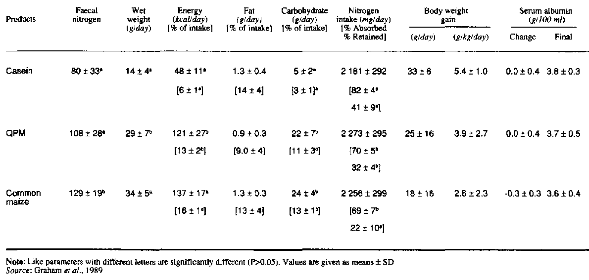 Similar studies were conducted by Pradilla et al. (1973) using the same variety of maize but with the opaque-2 gene (H-208 opaque). A crystalline endosperm containing the opaque-2 gene was also tested. The results are shown in Table 36, in which similar values may be observed for digestibility, biological value and nitrogen retention for the two maize selections containing the opaque-2 gene. These values were slightly lower than those for casein but significantly higher than values for common maize. In more recent studies Graham et al. (1989) evaluated QPM Nutricta, a maize variety containing the opaque-2 gene. This maize is high yielding, has a hard endosperm and contains high levels of lysine and tryptophan, although not as high as those in the original opaque-2 maize first studied. These authors used six male children aged 7.9 to 18.5 months who were recovering from malnutrition. Common maize and QPM as well as a casein diet were fed to provide 6.4 percent of the calories as protein. Total energy intake was approximately 125 kcal per kg per day, which was calculated to support weight and growth at previously established rates. The nitrogen balance results are shown in Table 37. Nitrogen absorption from QPM and common maize was 70 and 69 percent respectively, and 82 percent from casein. Nitrogen retention as a percentage of intake was 32 percent for QPM as compared with 41 percent for casein and 22 percent for common maize. These results, like others previously reported, confirm the great superiority of opaque2 maize to common maize as food for children.