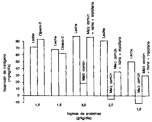 Un nivel de nitrógeno de 239 mg por kg de peso por día equivale a 20 g de maíz por kg por día, o aproximadamente los 200 g de maíz yare normalmente consumen los niños. La suplementación sólo con lisina tendría poco efecto. Ahora bien, si también se añade triptofano, el aumento de la retención de nitrógeno es notablemente superior e incluso sobrepasa al de la leche en el nivel más alto de proteínas de la dieta. La conclusión general a que se puede llegar a partir de los resultados obtenidos mediante la suplementación del maíz con aminoácidos es que hay que añadir lisina y triptofano para obtener una reacción significativa en lo tocante a la calidad de las proteínas, medida por la retención de nitrógeno. Asimismo, que ambos aminoácidos son parejamente limitadores, pese a que la adición de únicamente lisina tendia a mejorar levemente la calidad proteínica, en tanto que los resultados de la adición de triptofano eran incongruentes.