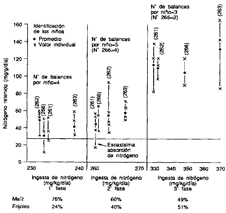 Quienes afirman que en la dieta la energía es más limitante que las proteínas pasan por alto la gran importancia de la calidad de las proteínas. Se ha demostrado que el efecto complementario descrito anteriormente también tiene lugar en los seres humanos. Se examinaron los resultados del balance de nitrógeno en estudios con niños alimentados a base de maíz tratado con cal y frijoles en dos proporciones fijas y ad libitum, según los deseos de los propios niños (Figura 6). El balance de nitrógeno en la proporción fijada en la 1a fase (76:24) fue interior al de una alimentación en una proporción de 60:40 de maíz/frijoles (2á fase). El balance de nitrógeno mejoró cuando se permitió a los niños elegir, y la elección se aproximó a 7 partes de maíz por 3 partes de frijoles, en peso. Igualmente importante es que también aumentó la ingesta total de alimentos. La proporción en la ingesta habitual de maíz y frijoles, según encuestas sobre dietas llevadas a cabo en el decenio de 1960, variaba entre 11:1 y 18:1,por lo que el suplemento que aportaban los frijoles era relativamente pequeño. Datos más recientes (Garcia y Urrutia, 1978), relativos a niños de tres años de edad, daban una proporción de 8:4 de maíz/frijoles, y aún menor en los niños de 6 a 11 meses de edad.