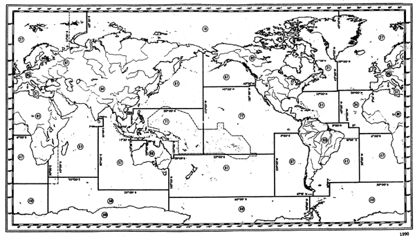 Comme dans le rapport précédent, les interactions sont envisagées sur la base des zones statistiques de pêche de la FAO, qui sont délimitées sur la carte ci-contre. Les estimations révisées des tailles des populations de mammifères marins, et les recherches récentes sur les habitudes alimentaires des mammifères marins n'ont, de manière générale, pas été incluses dans la présente mise à jour, sauf quand elles étaient particulièrement pertinentes en ce qui concerne une interaction spécifique.