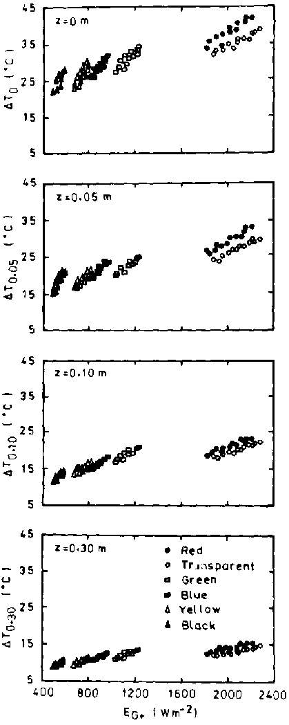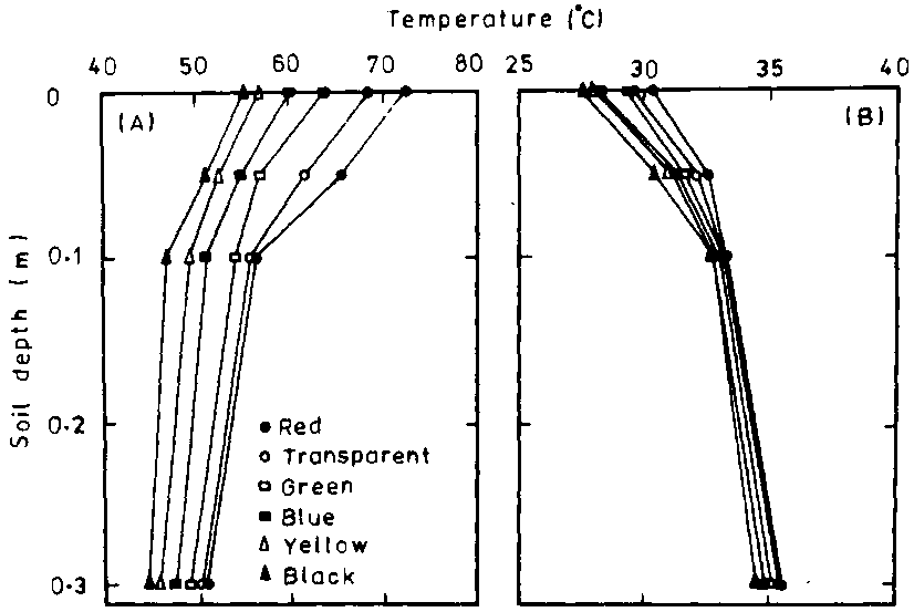 From the previous discussion, it is apparent that the photometric properties of the plastic soil mulch is an important applicable parameter which affects the soil temperature during soil solarization. The values of the temperature observed under the various mulches were in the following order: red > transparent > green > blue > yellow > black. It could be seen from the above results that the transparent mulch which is widely used by farmers in agriculture applications provides a better condition than the other mulches except the red one. Therefore according to the results, the red mulch is the most appropriate for soil solarization to control diseases caused by soilborne pathogens.
