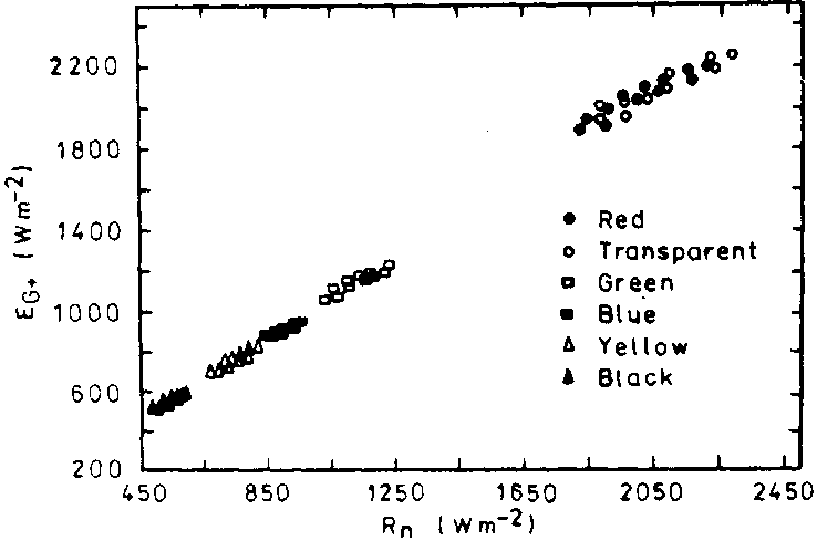 As the figure shows, the soil heat flux is closely related to the amount of radiation transmitted through the mulches. The best-fit line to the data points was obtained by the Hewlett-Packard linear regression analysis package. High values and even distribution of soil heat flux were found under red and transparent mulches. The soil heat flux under the rest of the mulches was strongly skewed toward lower values in the order of green > blue > yellow > black.