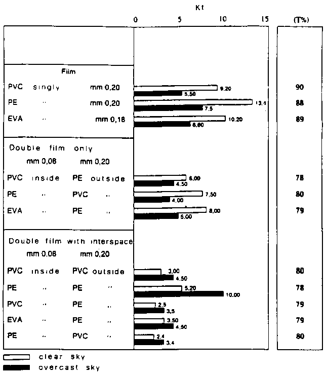 Total transmittance (Kt=W/m²°C) and total light transmission values experimentally calculated, under different climatic conditions for plastic materials widely used in agriculture, are reported in Table 3. They indicate that the single layered PVC films are better than those of PE and EVA which are in an intermediate position. Double films with or without interspace cause a reduction of Kt which reflects the decrease of light transmission. The combinations are PVC (0.08 mm) internally and PVC (0.20 mm) externally or PE (0.20 mm) externally and either PVC or EVA (0.08 mm) internally with values pf Kt of 3-3.54.5 and T 80-79-79 percent. However, it mut be considered that Kt is related to the wind speed and that a speed variation from 0 to 6 m/see will double the Kt value (9).