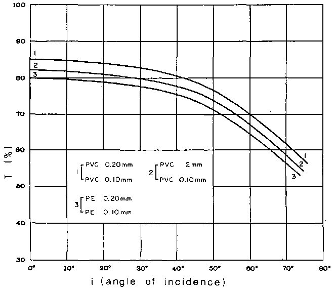 The trend of the variation of transmittance, as the incidence angle of the solar radiation varies; experimentally calculated (3), indicates that its reduction is negligible (around 5 percent) within an incidence angle from 0° to about 40°, but then with a rapid reduction of 30 percent at an incidence angle of 70° (Figure 2).