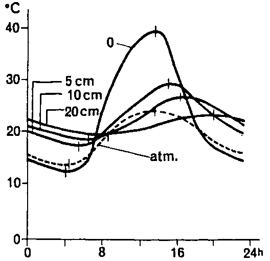Thermic properties of the soil. - The soil temperature in field conditions is never constant, the most important source of variation being the thermic energy caused by the absorption to the soil surface of the radiant energy of sun. Soil colour is important in the capture of the radiant energy; the lighter the colour and the drier the soil, the more it reflects. Maximum absorption occurs with a black, moist but not saturated, soil. The amplitude of the variations of the temperature along the soil profile is maximum at the surface and decreases rapidly in depth (Figure 4). The daily fluctuation is reduced by fractions of a degree already at a few dm deep (2).