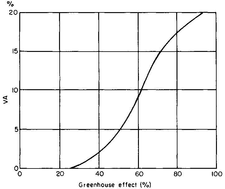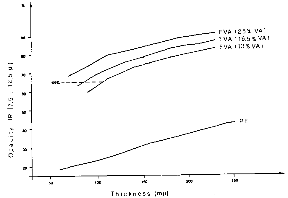 The films that are defined thermic and available on the market have a transmittance below 35 percent with regard to the long IR and higher than 82 percent for the visible and short IR (Figure 7). In PVC films transmittance to long IR is less than 15 percent and to short IR more than 92 percent. EVA films also have a transmittance to the long IR of less than 25 percent and to the short IR of about 89 percent. However, its greenhouse effect depends on the percentage of vinyl acetate (Figure 8) which varies between 12 and 14 percent in the films available on the market. The thickness of the film is also of importance (Figure 9).