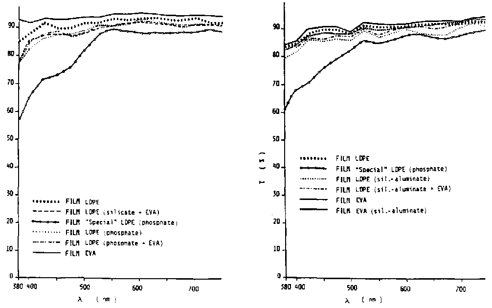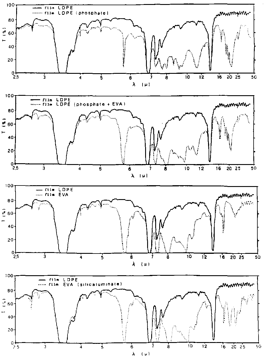 Other films with high greenhouse effect are the LOPE/EVA. Comparing two films of the same thickness, one single layered EVA and the other LDPE (50 percent) / EVA (50 percent) the second shows an inferior greenhouse effect because the concentration of vinyl acetate is reduced by 50 percent (4). This reduction can be recovered either by additivation or by reducing the thickness of LDPE in favour of EVA. The transmittance of the visible and IR radiations for such films are shown in Figures 10 and 11, respectively (6, 7).