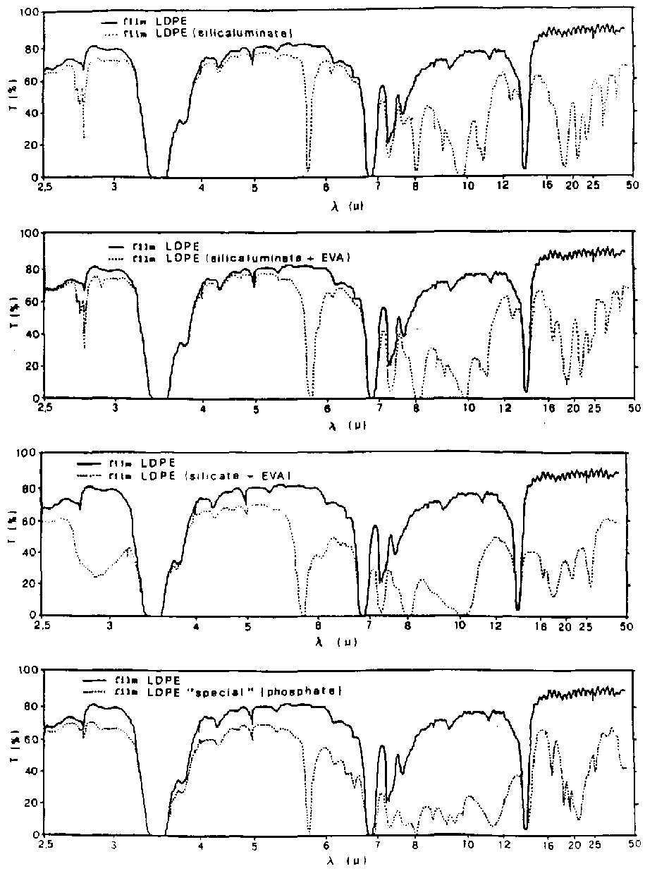 One of the most important characteristics relates to the capacity of transmission of short and medium-long infrared radiation because the permeability to the former and the impermeability to the latter limits the loss of heat. There are now available various infrared plastic materials which can he used as a barrier to heat (5).