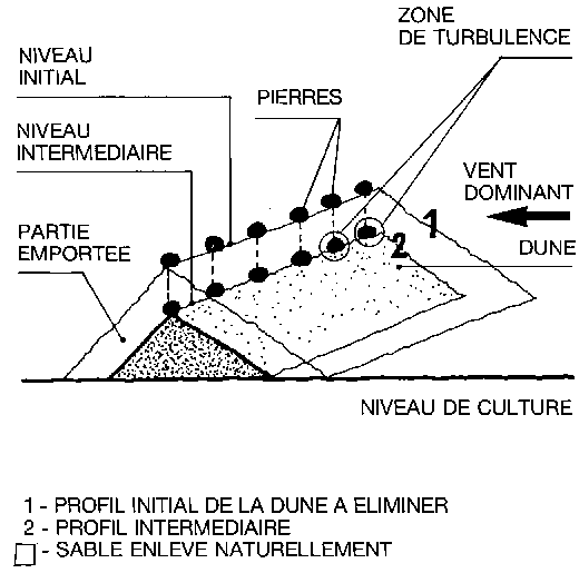 Des pierres de 20 à 30 cm de diamétre sont déposées le long de la crête des dunes à faire disparaître, et séparées les unes des autres par une distance pouvant varier, selon l'éloignement du lieu d'approvisionnement, de 0,50 à 1 mètre. Lorsque le vent érosif souffle, des turbulences se créent au niveau de chaque pierre. Ces turbulences augmentent ponctuellement la vitesse du vent et son énergie cinétique, lui permettant de transporter plus loin le sable remis en mouvement. un affouillement éolien se produit à la base de chaque pierre qui tend ainsi à descendre. D'autre part, entre deux pierres, il se crée un effet de "sifflet" se traduisant encore par une accélération de la vitesse du vent et de son énergie cinétique. Sous l'effet de ces deux actions, les petites dunes, qui s'érodent dans leur partie supérieure, diminuent progressivement jusqu'à disparaître complètement (voir figure 22 a).