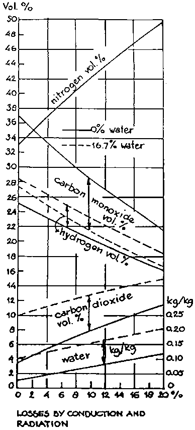 The procedure is to derive from mass balances of the four main ingoing elements (carbon, hydrogen, oxygen and nitrogen), an energy balance over the system and the relation given by the water-gas equilibrium. By further assuming that the amounts of methane in the producer gas per kg of dry fuel are constant (as is more or less the case of gasifiers under normal operating conditions) a set of relations becomes available permitting the calculation of gas compositions for a wide range of input parameters (fuel moisture content) and system characteristics (heat losses through convection, radiation and sensible heat in the gas). Theoretically calculated gas compositions-are given in figures 2.4 to 2.6. Generally a reasonably good agreement with experimental results is found.