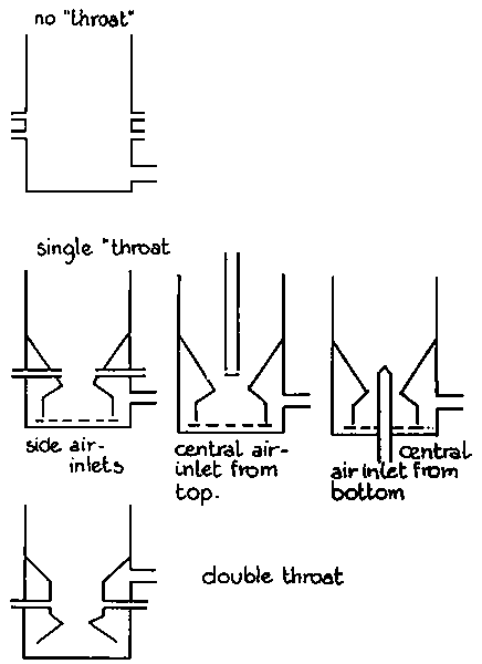 Venselaar (46) compares the design characteristics of a number of gasifiers that were commercially available during the Second World War. A distinction is made between "no throat" "single throat" and "double throat" (Imbert type) designs (see Figure 2.15). He comes to the conclusion that the three types differ mainly in maximum allowable hearth load, giving values of B max. of 0.03, 0.11 and 0.4, respectively for "no throat", "single throat" and "double throat" gasifiers.