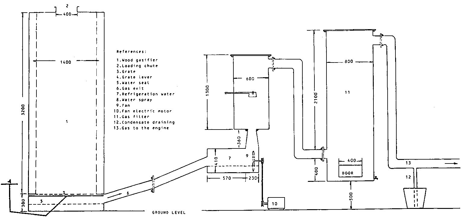 The wood gas generator consists of a unit with sheet iron walls 6 mm thick lined on the inside with bricks having 50 percent alumina (AL2O3) content. It has a total height of 3600 mm and its external diameter is 1400 mm. The fuel (wood) loading chute has a diameter of 400 mm. The reactor has cast iron grates installed 300 mm from the bottom. These grates are set 20 mm apart and have a lever movement system for removing ashes. Under the grates, 150 mm from the base, is a water cooling system with a three-fold function as follows: