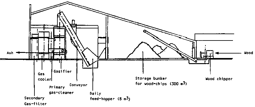 Figure 6.2 Schematic Lay-out of the wood-fuel preparation and gasifier units (g)
