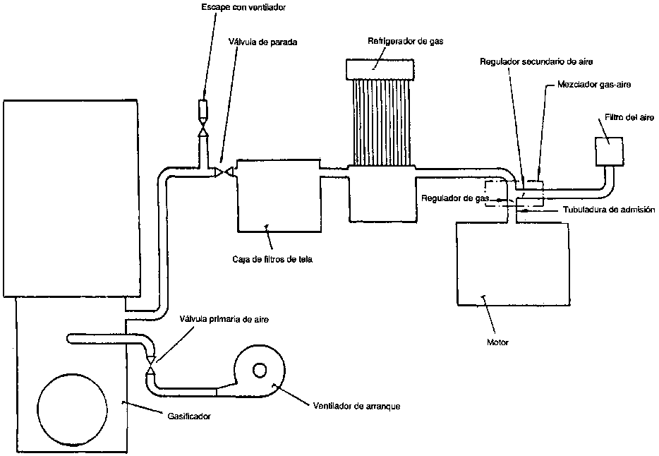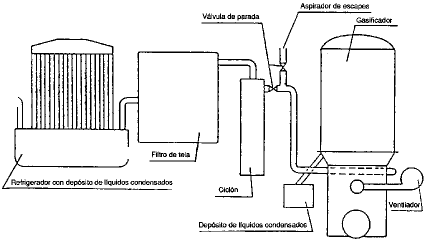 La depuración del gas para un sistema típica de gasificador de madera empleado en la Segunda Guerra Mundial, se lograba mediante un ciclón, un refrigerador de gas con cierta acción depuradora y un filtro de lecho compacto; véase la Figura 3.5.a.