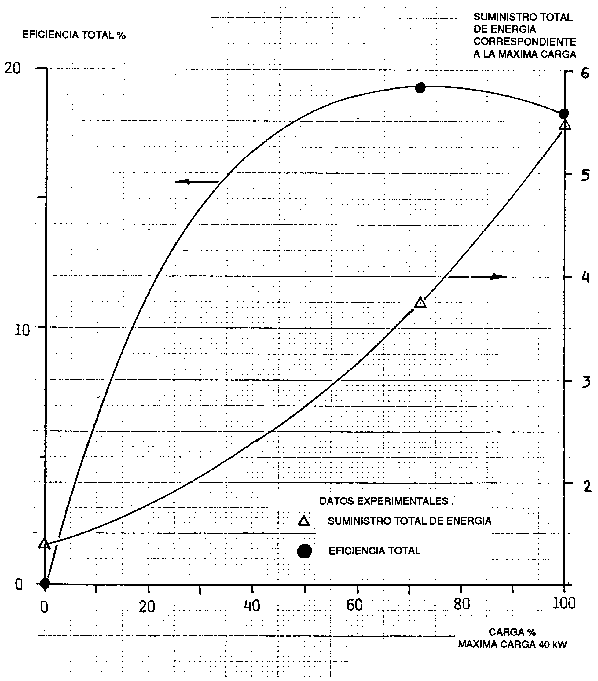 se ha calculado que es del orden del 70 por ciento para una amplitud de carga entre el 100 y el 20 por ciento. Se ha determinado que el contenido de alquitrán en el gas está entre 0,04 y 0,20 g/m³ para la variación real de cargas. El contenido de alquitrán puede compararse con las normas dadas por Tiedema et al (42), según las cuales, el contenido de alquitrán debe ser inferior a 0,5 g/m³, si el gas tiene que servir como combustible para un motor de combustión interna.