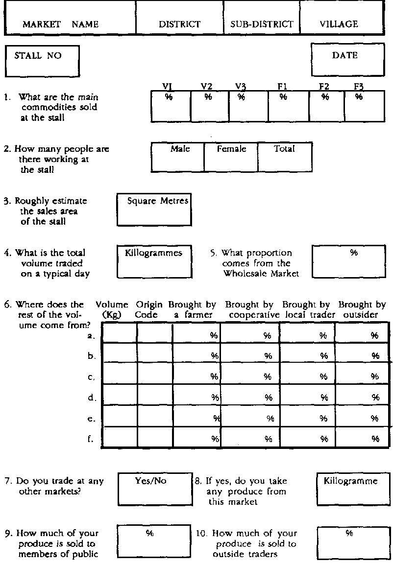 · by interviewing stallholders or wholesalers on a sample basis. A questionnaire for this method, which has been used for a number of 20 percent sample surveys is shown in Figure 16. The survey enumerator stopped at every fifth stallholder he or she came to. A brief interview was held and a record was taken of the overall volume and types of produce that were expected to be traded that day, the origin of the produce and the expected destination (usually based on the previous day's trade). The survey data can be analysed using computer spreadsheets (the data in the case of a 20 percent sample expanded by 5 times to obtain a 100 percent coverage) to provide the following information: