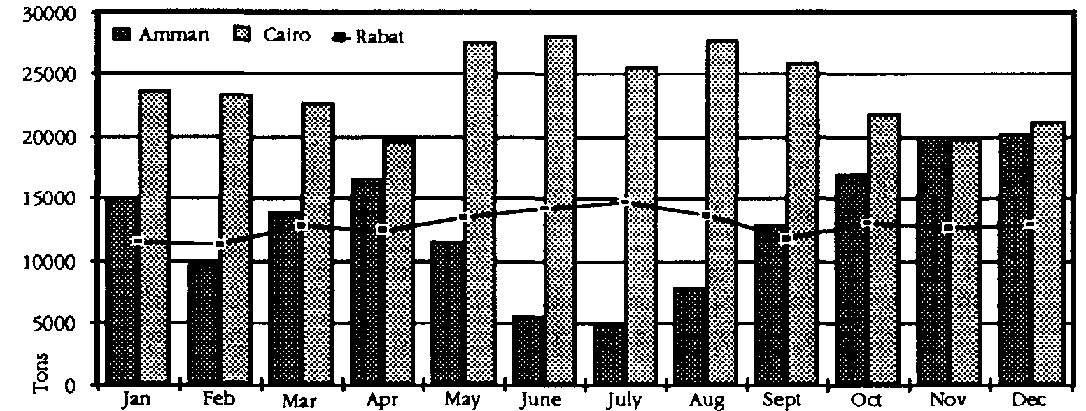 Seasonal variations in trade. A key factor in market operations is the degree to which trade varies by season, reflecting peaks in production. If a marketing authority maintains daily records from an existing market then a comprehensive data base will be available for making such an assessment. Table 12.2 shows such a set of data for three wholesale markets in the Near East, the peak months being compared to the average months using a ratio. Figure 20 illustrates the same data as a histogram, demonstrating the comparatively small seasonal variation at the Rabat wholesale market, compared with Amman and Cairo.