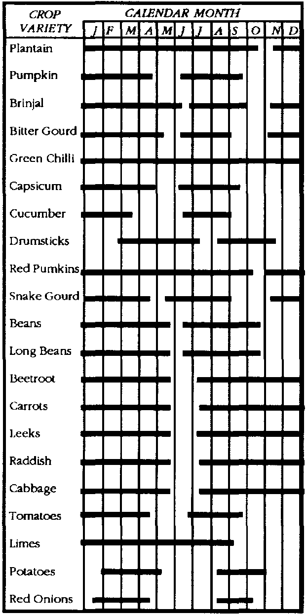 Typical cropping calendars for upland/lowland, rainfed systems and off-season production in irrigated areas can provide useful models for examining seasonal variations in horticultural production. A simplified example for Sri Lanka of such a cropping pattern is shown in Figure 21.