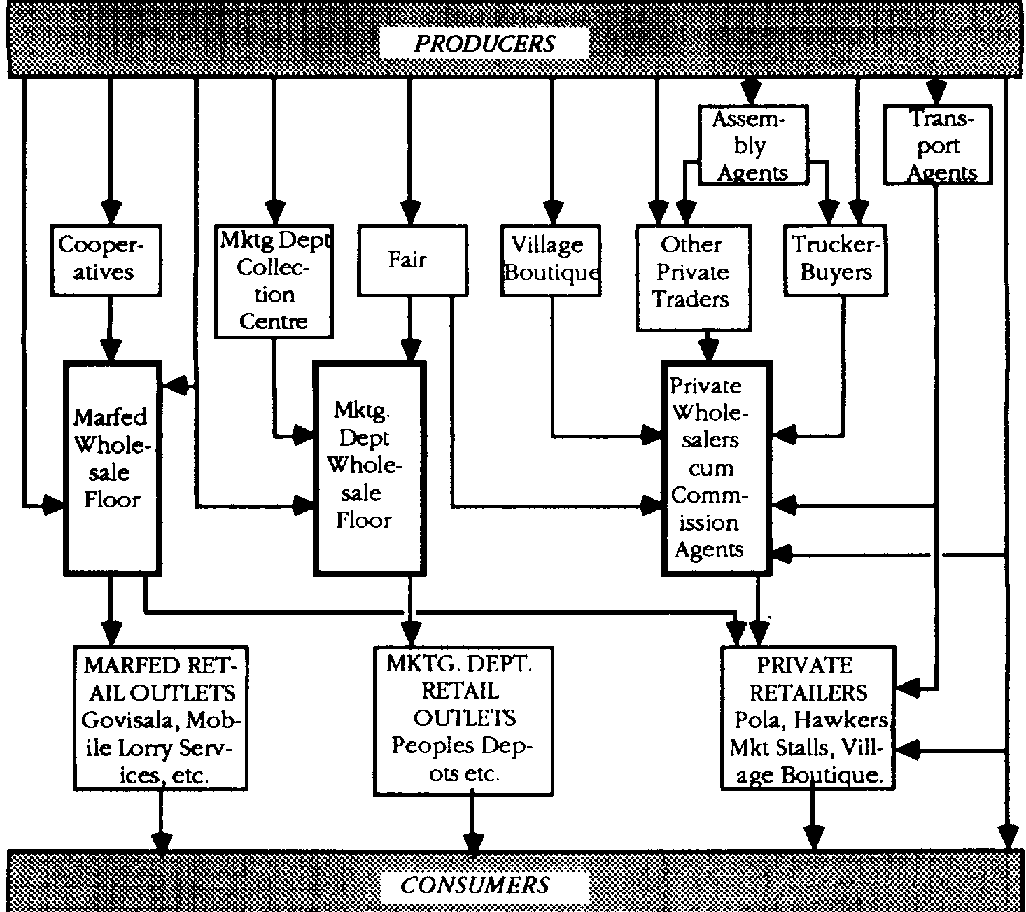 Marketing channels. Another consideration in understanding the existing pattern of trade is the problem of defining the channels through which production might pass. Reference has been made in the previous sections as to how this may vary according to factors such as the location of production areas, credit arrangements and seasonality. Other factors such as political and cultural conditions, the level of transport facilities and the presence of a traditional network of rural markets will also influence how the channels may operate. Figure 22 illustrates the complex pattern of channels that exists in Sri Lanka