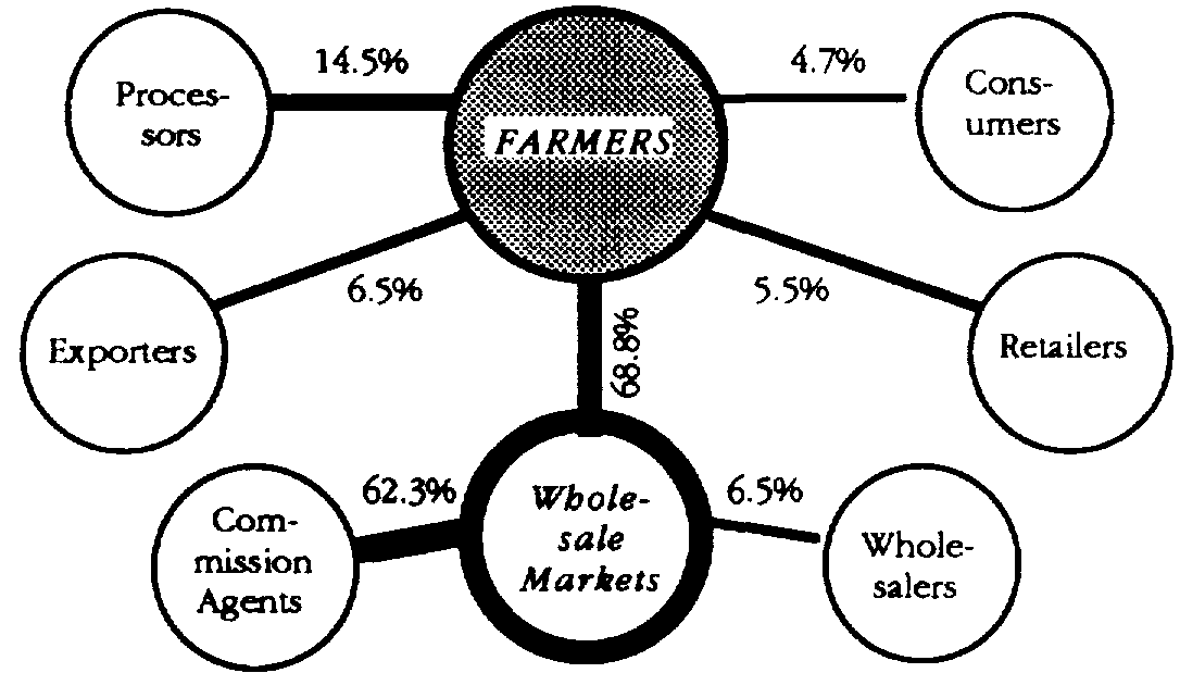 In analysing existing trading patterns the intention should be to understand how a market relates to all the other outlets through which production is channelled. This will vary greatly, both by type of crop and by season. In some cases, typically with fruit production, the majority of produce may be sold at field level. This provides a guaranteed outlet and is often combined with an arrangement for providing cash before harvesting (the crop is "bought off the tree" In other cases, crops are traded through a hierarchy of local markets, which assemble produce for sending to a local secondary wholesale market or by-pass this market by sending directly to a terminal wholesale market in a distant city.