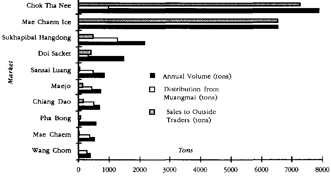 To make such estimates it may be necessary to extend the scope of surveys to include local assembly markets so that the role that they play can also be defined. Figure 24 illustrates the results of such a survey in Northern Thailand Some of the markets are exclusively involved with the assembly of produce, whilst others are involved mainly with distributing produce to rural consumers received from the nearby urban wholesale market of Muang mad, in Chiang Mail