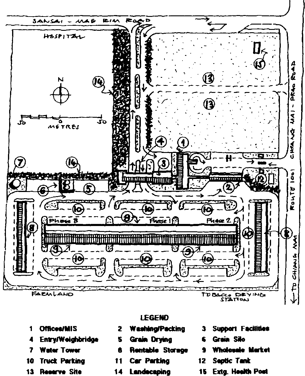 Land-use analysis. The estimates prepared of space requirements for the buildings should be related to that of the whole site. Table 13.8 shows an illustration of a phased estimate of the market buildings needed for the Kalimati site in Nepal, including the space requirements for the ancillary and service buildings, and for a 2,000 metric ton cold storage facility. In the estimate an allowance was made for the substantial parking provision and road system which will be needed by the market at ultimate development. Although present retailers at the market may continue with the use of small hand carts, this pattern is likely to change rapidly with the introduction of small pick-ups and trucks.