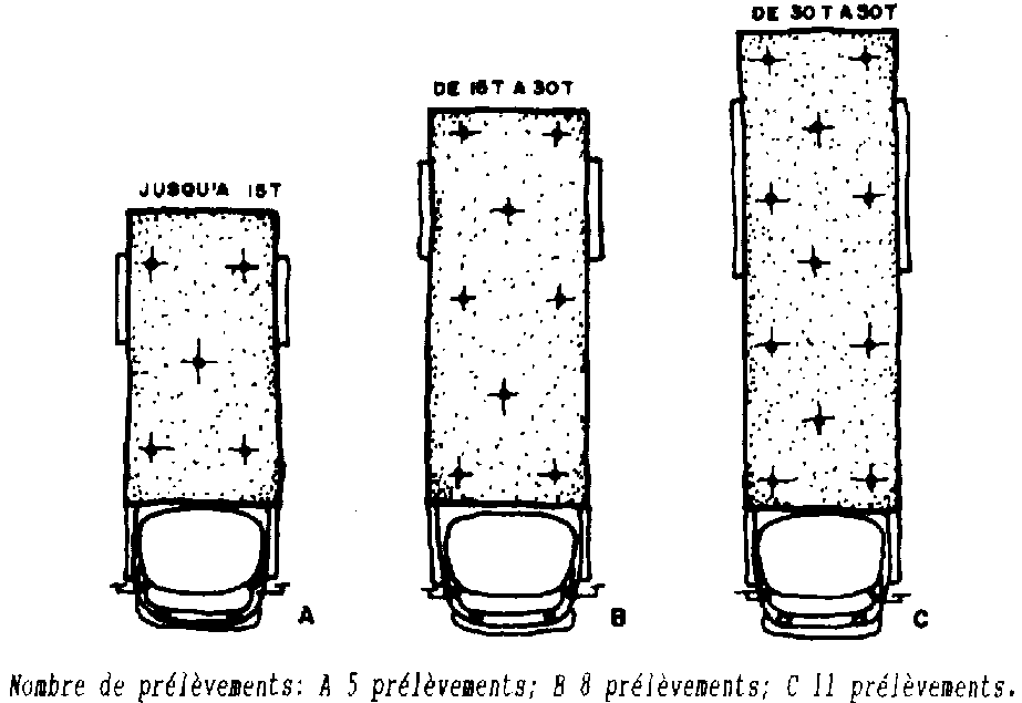 Les points où effectuer les prélèvements et leur nombre dépendent de la quantité totale de grains, comme l'indique la suite de schémas suivants.