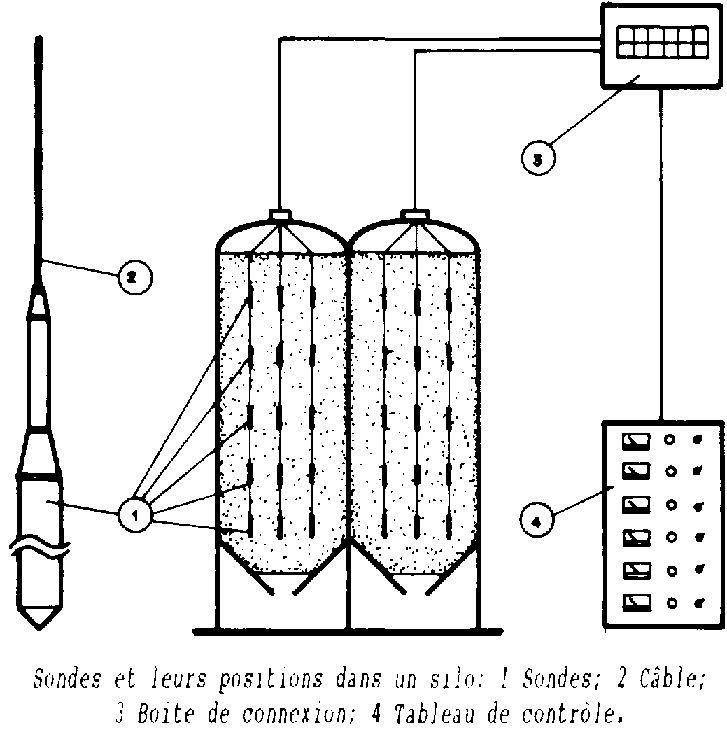 Introduites dans les grains après remplissage des cellules, ces sondes sont reliées électriquement, avec du câble téléphonique, aux appareils de lecture individuelle (boîtiers de lecture portatif) ou centralisée (tableaux de contrôle).