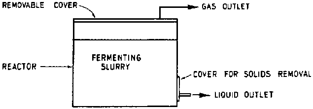 Batch and Dry Fermentation: This is the simplest of all the processes. The operation involves merely charging an airtight reactor with the substrate, a seed inoculum, and in some cases a chemical (regularly a base) to maintain almost neutral pH. The reactor is then sealed, and fermentation is allowed to proceed for 30 - 180 days, depending on ambient temperature. During this period, the daily gas production builds up to a maximum, and then declines. This fermentation can be conducted at "normal" solids content (6 - 10%) or at high concentrations (>20%), which is then known as "dry" fermentation. Its main components are shown in Figure 7.1.