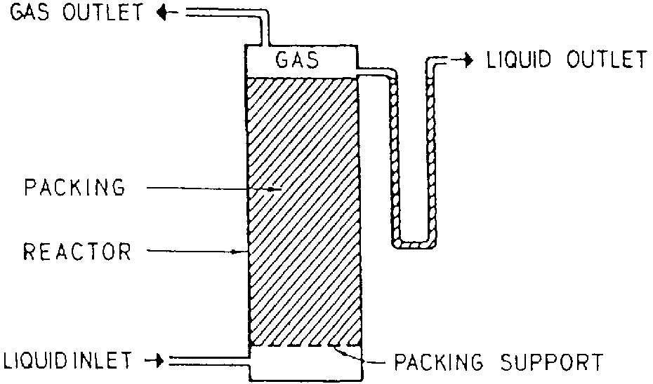 In order to reduce reactor volume, a unit known as the immobilized growth digester has been evolved. One of the earliest and simplest types of this design was the anaerobic filter. This typically consists of a tall reactor (H/D = 8 - 10) filled with media on, or in which the organisms can grow or become entrapped (see Figure 7.6). Media used have varied from river pebbles (void volume = 0.5) to plastic media (0.9), although any material which provides a high surface area per unit volume is suitable. The choice of media depends on considerations such as cost, void volume, availability and weight. The waste to be treated is usually passed upward through the filter, and exits through a gas syphon, although downflow configurations can be used. The organisms growing in the filter consist of two types: those attached to the media, and those entrapped in a suspended form, within the interstices of the media. At low hydraulic loading rates, both sorts are prevalent, while at high hydraulic loads the suspended organisms are washed out, leaving only the attached forms. Due to entrapment and attachment, high biological solids retention times (f ) are possible, at very low HRTs.