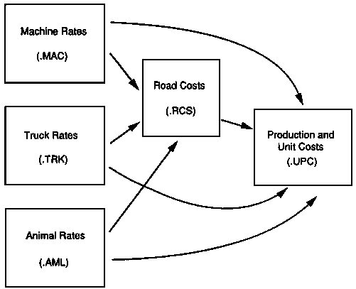 PACE is divided into three parts: (1) machine rate calculations, (2) road construction calculations, and (3) harvesting production and unit cost calculations. Analysis begins with the preparation of machine rates for combinations of equipment and labor which will be used in road construction and harvesting. Next, road construction costs are developed using the machine rates from (1). And last, machine rates, road costs, and harvesting production rates are combined to develop production and unit cost estimates (Figure 6.1).