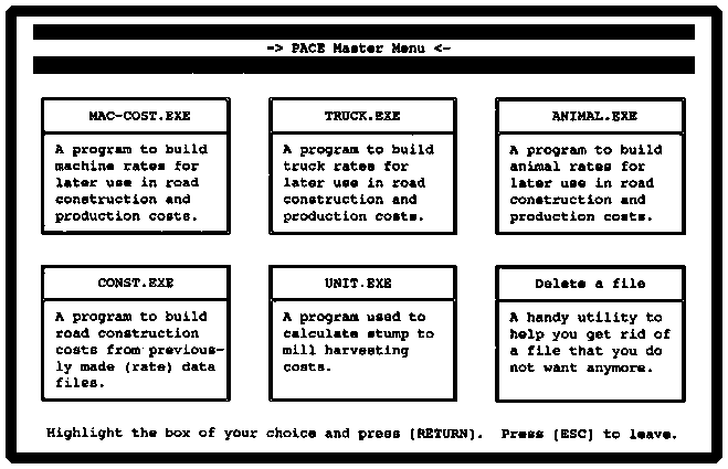 The computer program, PACE (Production and Cost Evaluation), was developed to assist in calculating machine rates, road construction costs, and harvesting costs. It can be used to evaluate tradeoffs between road costs and harvesting costs. This section will describe the PACE program and can be used as a user guide. A computer disk with the PACE program for IBM PC/XT/AT and compatibles are provided with this manual. See Section 6.7 for installation instructions.