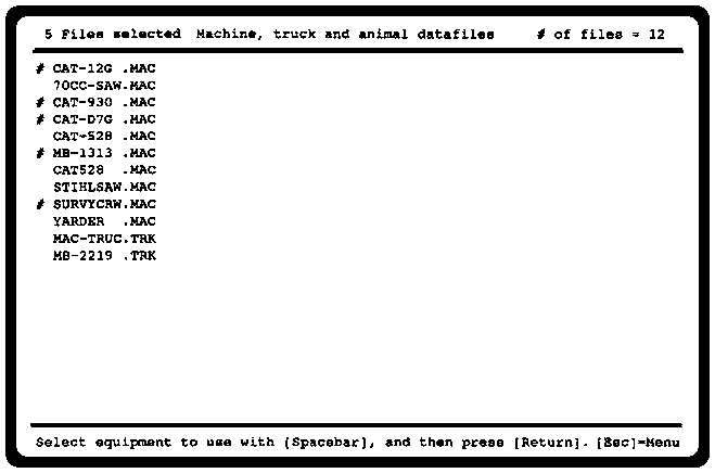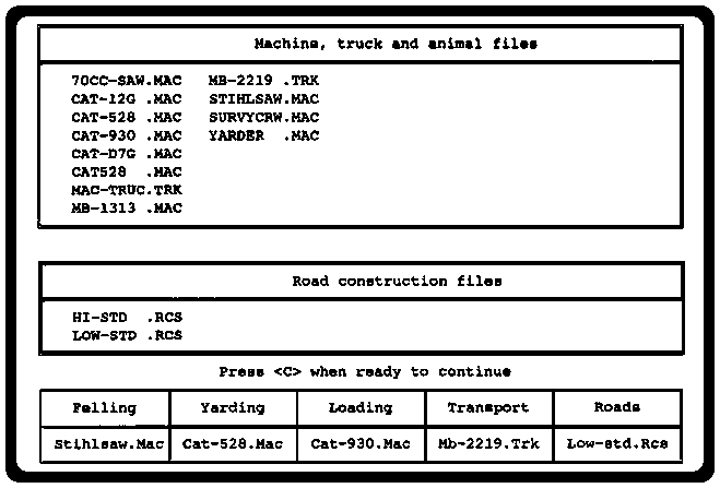 The sensitivity of production and costs to changes in the skidding or road cost variables can be examined at any time by paging to the appropriate screen and changing the data. If the machine rate or road standard is changed in this way, the percentage in ownership, operating, and labor remains the same with the new rate. To change to a different machine rate or road file, return to the menu <esc> and read the new machine rate files (R). Then, use the cursor and tab keys as before. The UNIT.EXE program will read the new cost files and your other data will still be available. Remember to save your Unit Cost file before you exit the UNIT.EXE program.