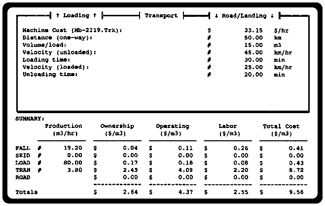 The skidding production and costs will not appear until after the road and landing data window has been completed because the road spacing information is needed and is not available at this point. |