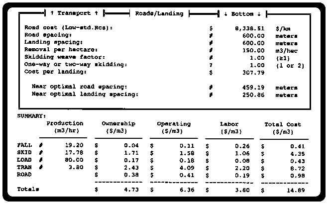 The near optimal road and landing spacing is shown on the Road/Landings screen (Figure 6.19). To find the cost associated with this road and landing spacing, enter the road spacing and landing spacing indicated. The results are shown in Figure 6.20. A reduction of $0.17 per cubic meter is achieved by reducing the road spacing to 459 m and the landing spacing to 250 meters. Although the road cost increases to $1.39 per cubic meter, the reduced skidding cost more than compensates for this increase.