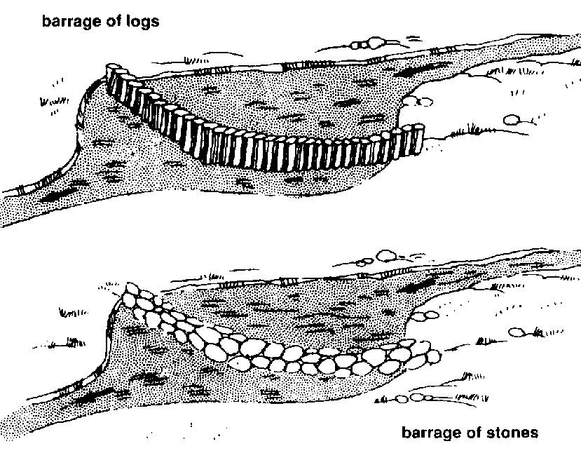 136 You can build a simple barrage using a woven mesh of tree branches like the one shown above. You can also use loose stones or rocks or logs set into the stream bottom.