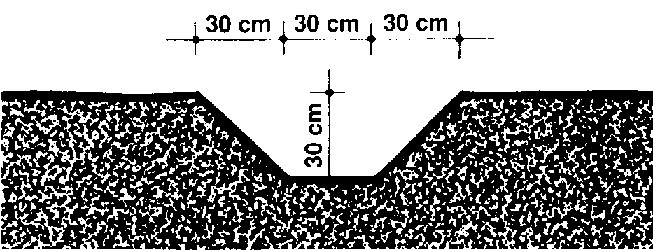 145 The ditch should have very little slope. You can use a straight board and a mason's level to help you dig your ditch.