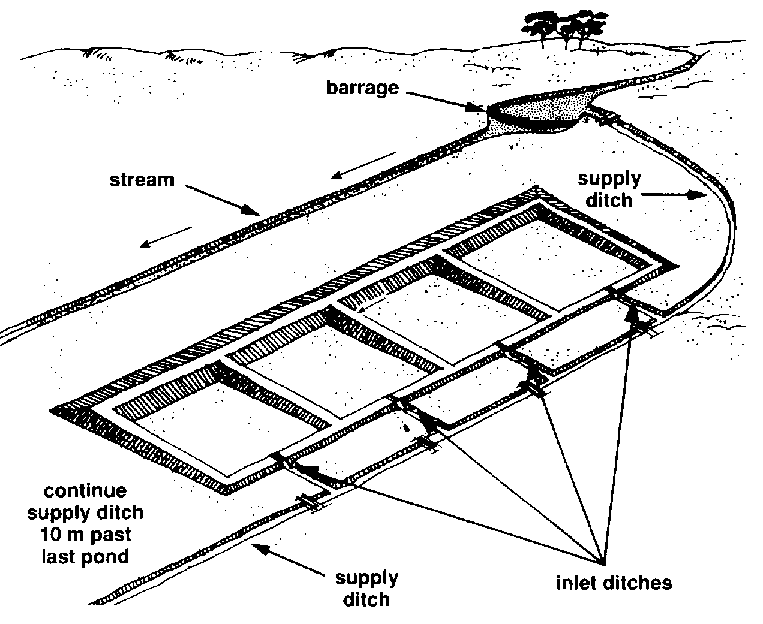 165 For better control of the water supply to each pond, you can build smaller sluices in the supply ditch at the lower corners of each inlet ditch, as shown in the drawing.