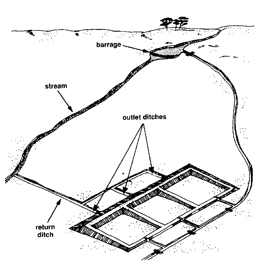 142 Begin by digging the supply ditch just behind the barrage where the water is deepest. However, dig it in such a way that the water in the stream will not flow into the ditch.