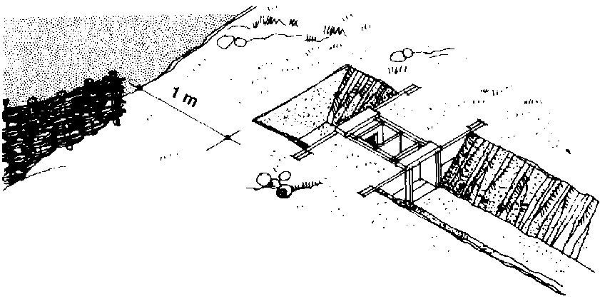 159 Build this sluice at the top of the supply ditch just behind the 1-metre strip of soil that you left at the edge of the water when you began digging the ditch.