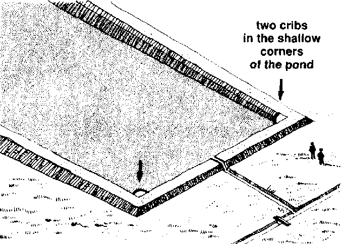 214 If you have a pond that is bigger than 500 square metres you should build two cribs in the pond. The drawings below and on the next page show you where to put them.