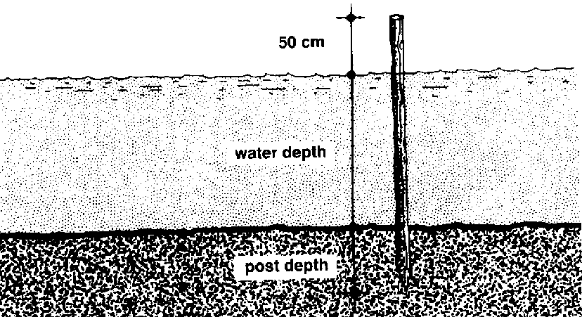 385 All posts must reach at least 50 centimetres above the highest water level. So the length of each post must equal the depth of the water, plus the depth that each post must be driven into the bottom, plus 50 centimetres for the segment above the water.