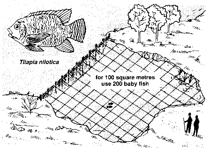 398 If you are raising Tilapia nilotica you will need to put in two baby fish for each square metre of pen. So, if you have built a small pen of 100 square metres you will need 200 baby fish.
