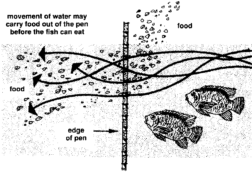 405 However, with a pen built in a stream, lake or reservoir, there may be little natural food and the movement of water may carry the food that you give the fish outside the pen where the fish cannot get it.
