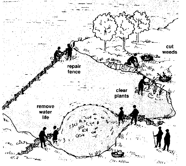 429 After you have harvested, clean and repair your pen as quickly as you can so that you can begin again. You must cut the weeds and grass on the banks clear out most of the plants in the water and take away all rubbish clean and repair the fence and make sure that it is still buried in the pen bottom remove unwanted fish, crabs and any other water life using a fine-mesh net.