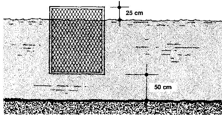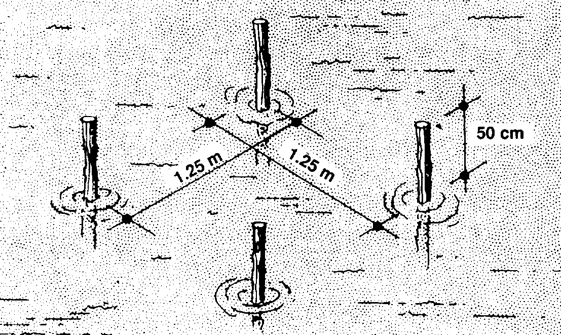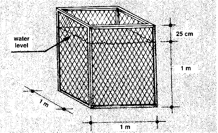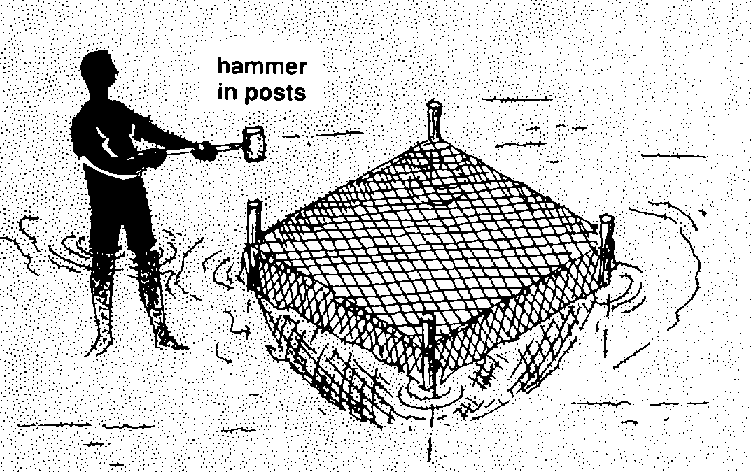 451 Drive four posts into the bottom to form a square of 1.25 by 1.25 metres The top of the posts should reach about 50 centimetres above the water.