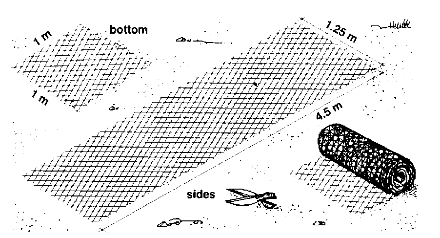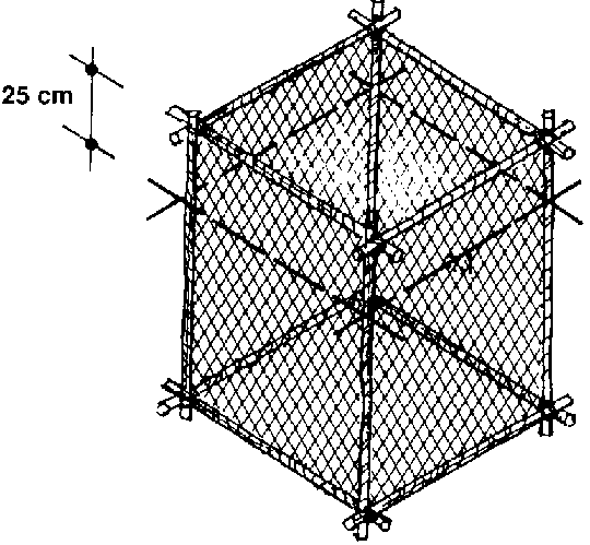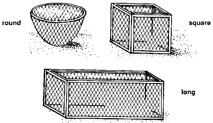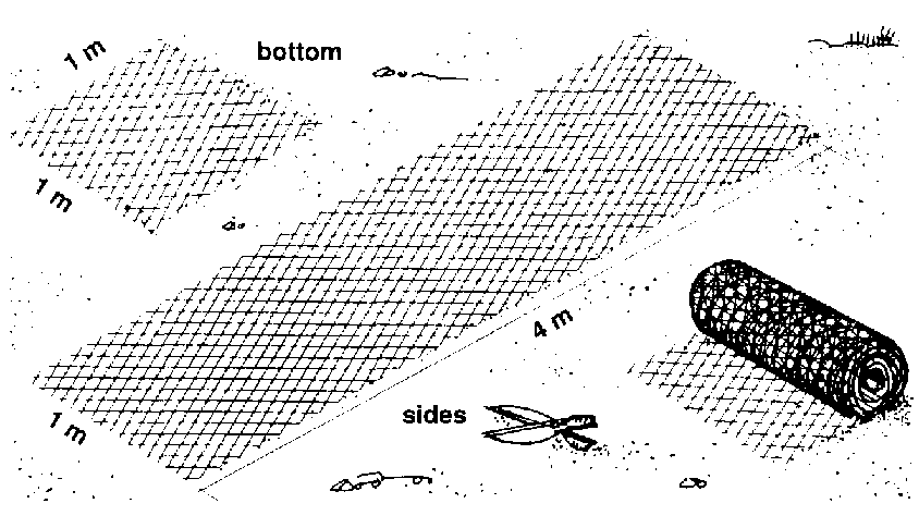461 If you have used fishing net or woven material, tie a length of rope to the bottom of each corner to be used to attach weights when the cage is in the water.